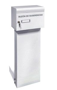 BUZÓN DE SUGERENCIAS Descripción Buzón de sugerencias de acero lacado y de gran capacidad. Dispone de un soporte de acero Posibilidad de rotulación a medida. Referencia 2050101 Dimensiones