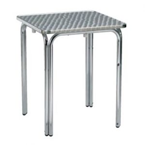 Mesa Bar-1 apilable con estructura tubular (Ø28 x 2 mm de grosor) de aluminio anodizado brillante. Interior de la superficie de la mesa con aglomerado de alta densidad.