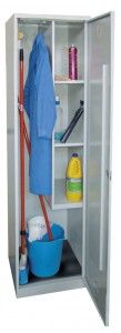 Taquilla de metal para material de limpieza con cerradura. Estructura soldada, no necesita montaje, pintado con epoxi. En el interior tiene tres estanterías, una barra porta perchas y ganchos.